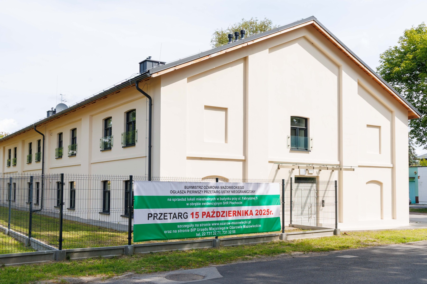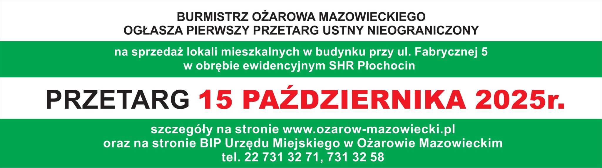 Ogłasza się pierwszy przetarg ustny nieograniczony na sprzedaż lokali mieszkalnych w budynku przy ul. Fabrycznej 5 zlokalizowanym na działce ewidencyjnej nr 3/15 w obrębie ewidencyjnym SHR Płochocin wraz z udziałem w nieruchomości wspólnej, w gminie Ożarów Mazowiecki