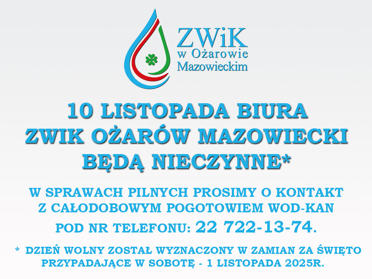 10 listopada Biura ZWiK Ożarów Mazowiecki będą nieczynne.