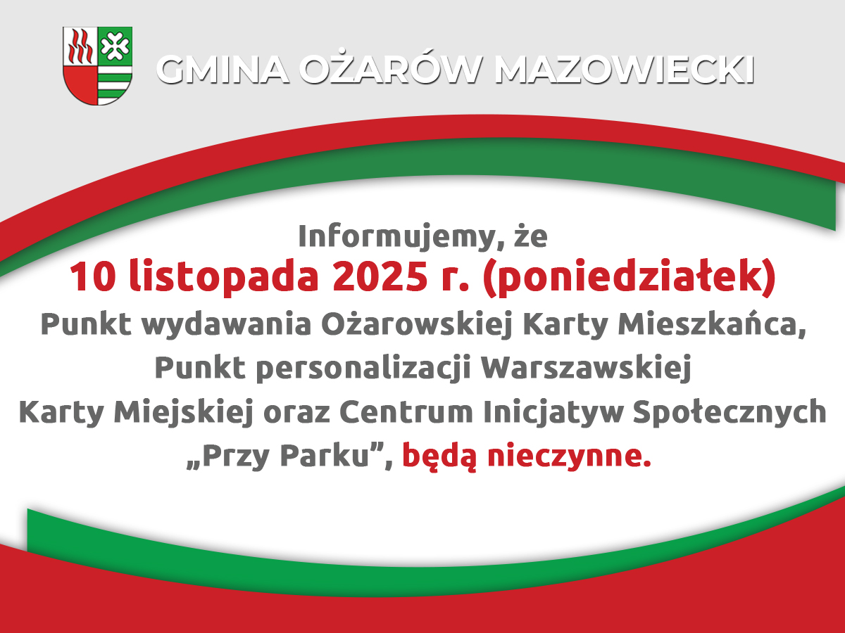 10 listopada nieczynny będzie Punkt personalizacji Warszawskiej Karty Miejskiej oraz Punkt wydawania Ożarowskiej Karty Mieszkańca 07.11.2025 Udostępnij Wyślij za pomocą e-mail