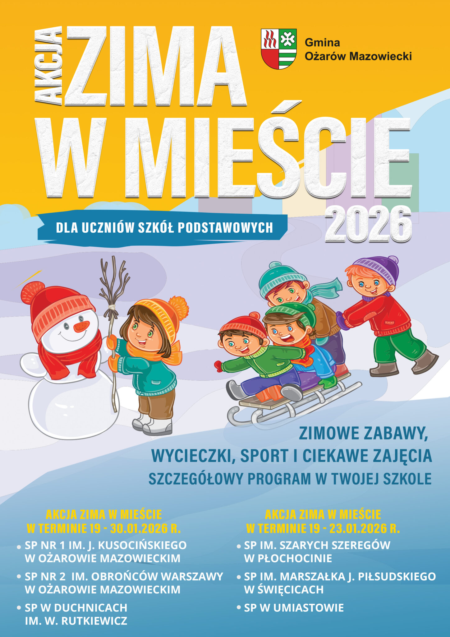W terminie od 19 do 30 stycznia 2026 roku, uczniowie klas I-VIII szkół podstawowych będą mogli wziąć udział w akcji „Zima w mieście 2026”, która jest organizowana we wszystkich publicznych szkołach podstawowych na terenie gminy Ożarów Mazowiecki.