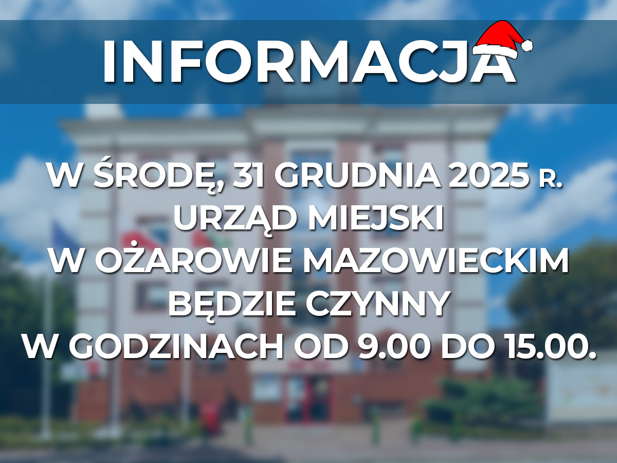 Informacja o godzinach pracy Urzędu Miejskiego 31 grudnia 2025 r. 27.12.2025 Udostępnij Wyślij za pomocą e-mail