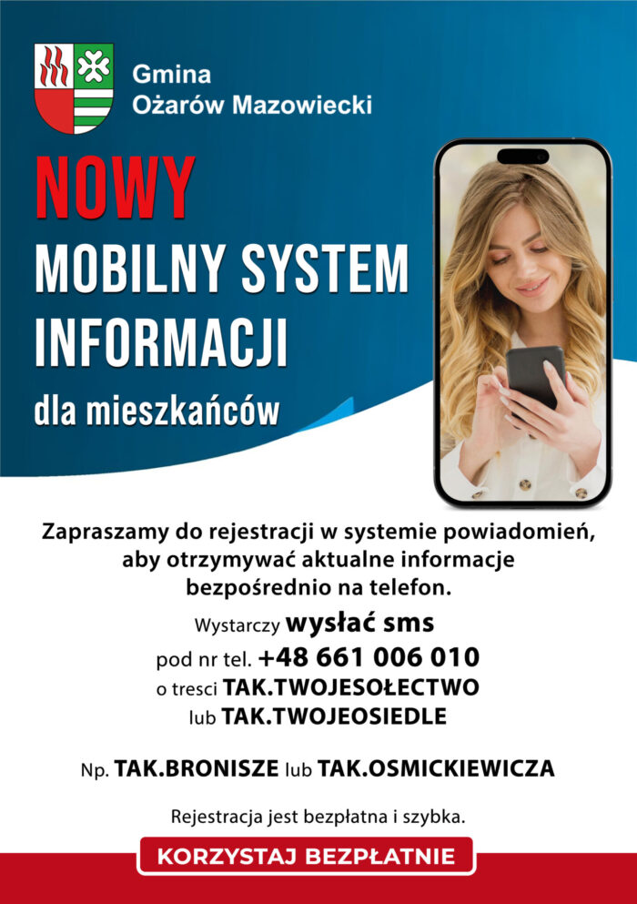 Smartfon to dzisiaj najskuteczniejsze i najszybsze źródło informacji. Gmina Ożarów Mazowiecki zaprasza do dołączenia do nowego systemu bezpłatnych powiadomień SMS. Dzięki niemu ważne komunikaty, zaproszenia na wydarzenia i ostrzeżenia w sytuacjach kryzysowych trafią bezpośrednio na zarejestrowane numery telefonów.