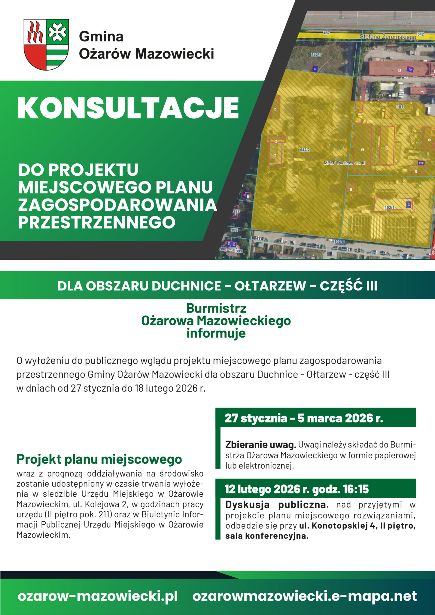 Dyskusja publiczna nad przyjętymi w projekcie planu miejscowego rozwiązaniami odbędzie się w dniu 12.02.2026 r. o godz. 16.15. w Ożarowie Mazowieckim w budynku przy ul. Konotopskiej 4 (II piętro, sala konferencyjna).