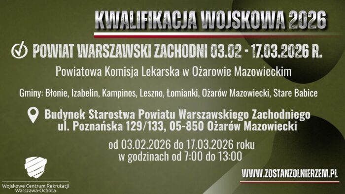 Kwalifikacja wojskowa w powiecie warszawskim zachodnim rozpocznie się 3 lutego i potrwa do 17 marca. Miejsce Powiatowej Komisji Lekarskiej w Ożarowie Mazowieckim: Budynek Starostwa Powiatu Warszawskiego Zachodniego, ul. Poznańska 129/133, 05-850 Ożarów Mazowiecki.