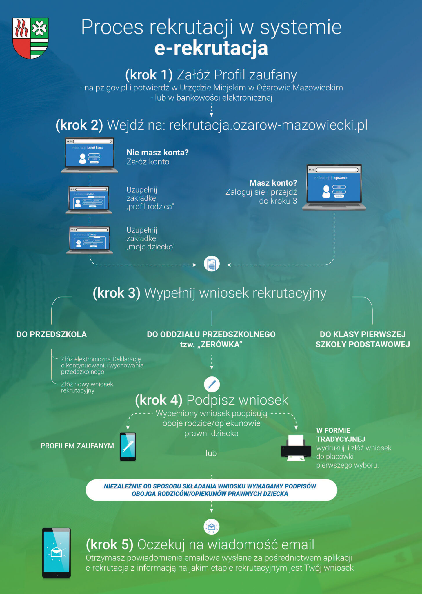 Rekrutacja do publicznych przedszkoli, oddziałów przedszkolnych i klas pierwszych szkół podstawowych odbywać się będzie poprzez System Elektronicznej Rekrutacji. Wniosek rekrutacyjny wraz z załącznikami składa się elektronicznie za pośrednictwem systemu rekrutacji do placówek oświatowych Gminy Ożarów Mazowiecki, logując się na stronie rekrutacja.ozarow-mazowiecki.pl