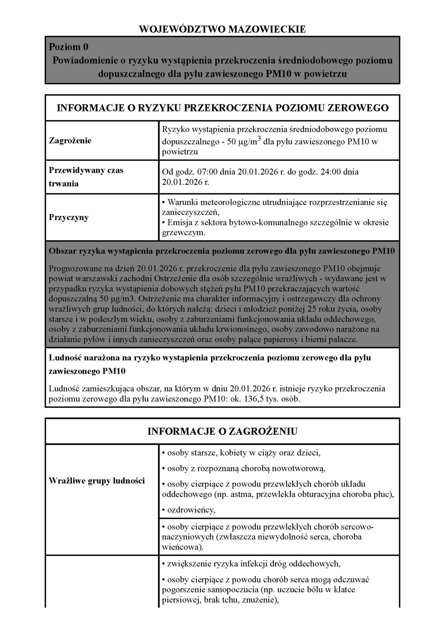 Powiadomienie o ryzyku wystąpienia przekroczenia średniodobowego poziomu dopuszczalnego dla pyłu zawieszonego PM10 w powietrzu 20.01.2026 Udostępnij Wyślij za pomocą e-mail