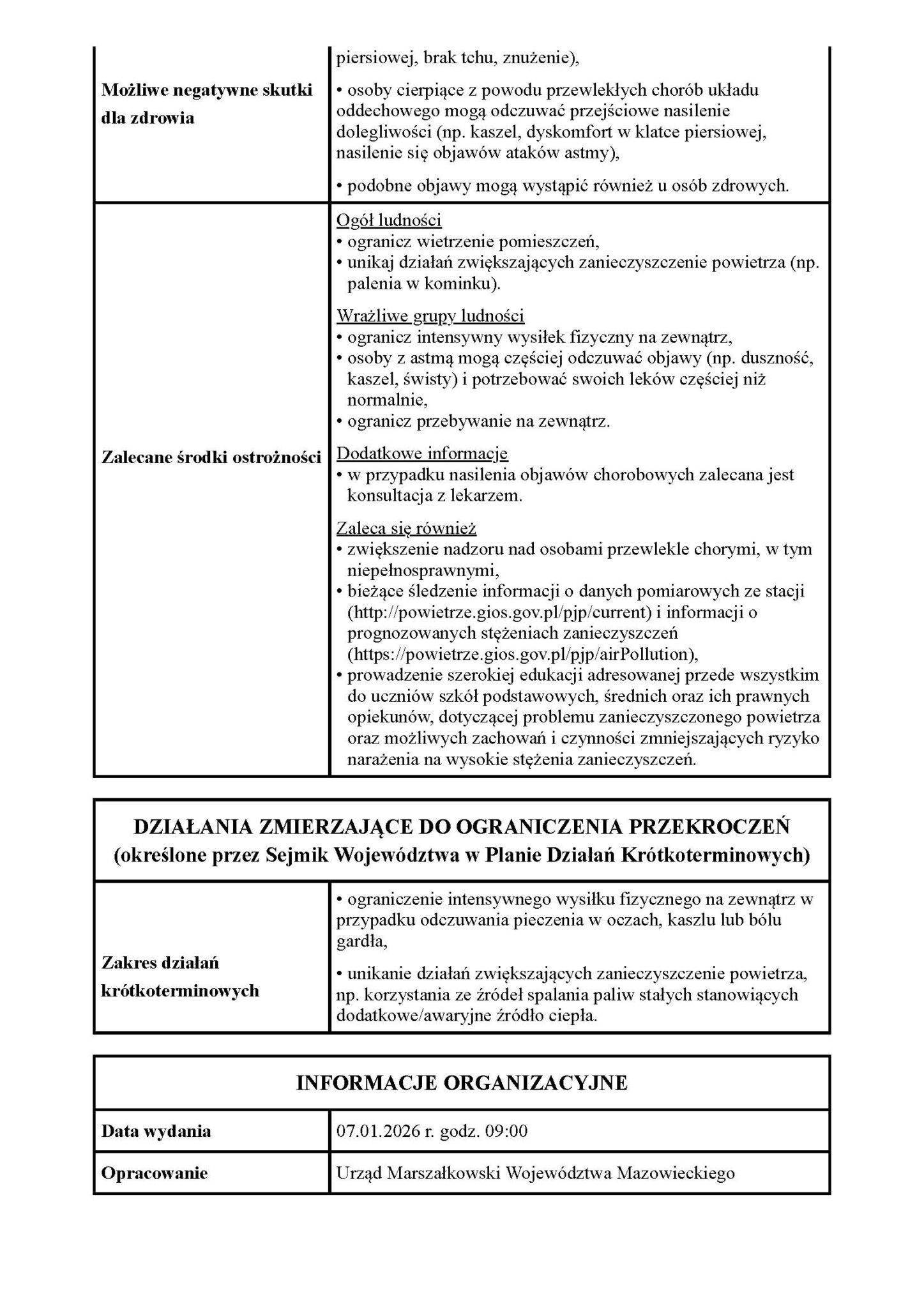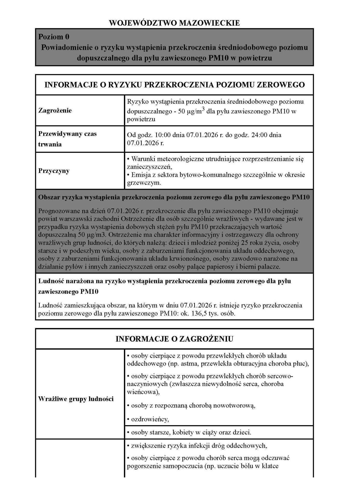 Powiadomienie o ryzyku wystąpienia przekroczenia średniodobowego poziomu dopuszczalnego dla pyłu zawieszonego PM10 w powietrzu 07.01.2026 Udostępnij Wyślij za pomocą e-mail