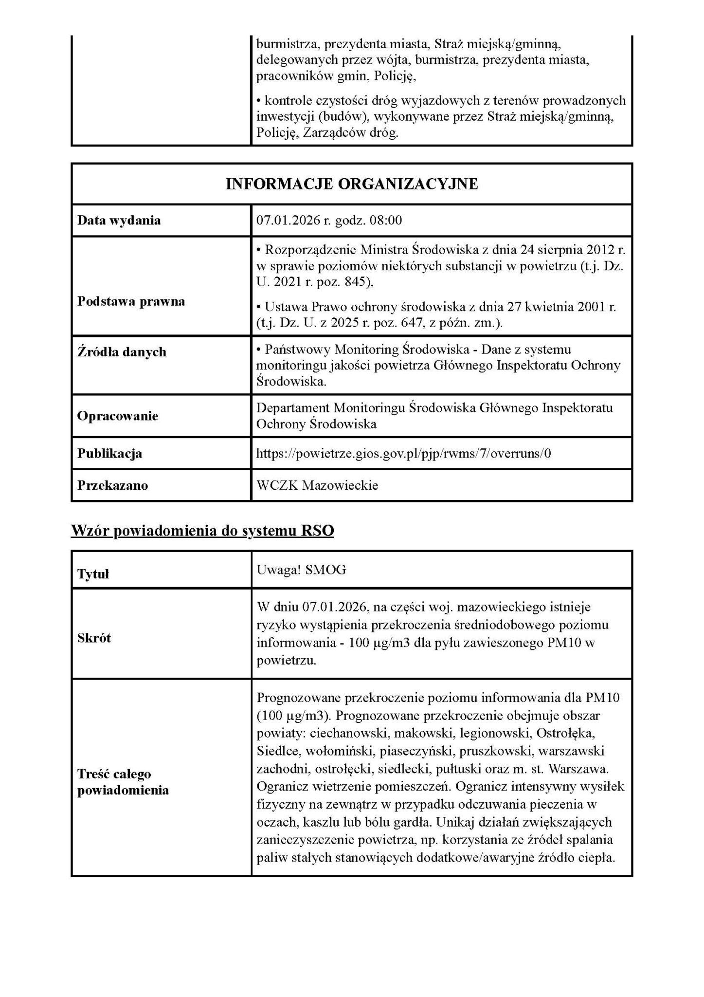 Ryzyko wystąpienia przekroczenia średniodobowego poziomu informowania – 100 μg/m 3 dla pyłu zawieszonego PM10 w powietrzu 07.01.2026 Udostępnij Wyślij za pomocą e-mail